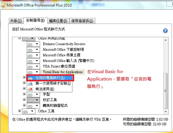 試了很久才發現,有個設定要在調整,設定過程中可以決定要安裝哪些套件,但不知道為什麼在「Visual Basic for Applications」預設不安裝