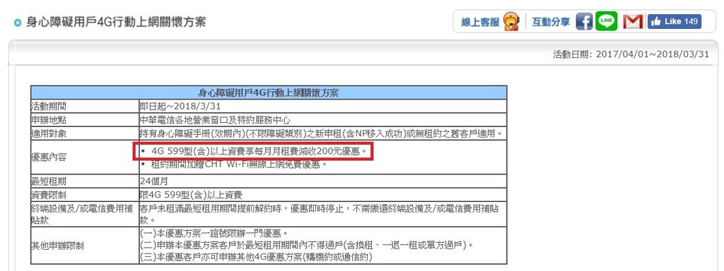 中華電信給予身心障礙人士的優惠相較其他業者是最有感的,只要申辦4G 599以上的費率,每個月月租費減收200元。