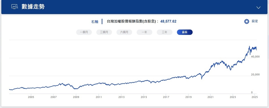 個人認為依下圖數據資料顯示(台股加權股價報酬指數),大盤指數年化報酬約莫8~10%,只要好好長期持有市值型ETF,每個月將辛苦勞力所獲得到的儲蓄,定期分批投入市場,便能享受股市長期所帶來的合理報酬,即使某些時間會遇到熊市,但只要時間一長,絕對可以【慢慢致富】。